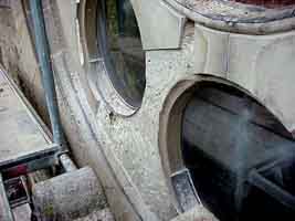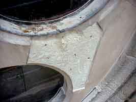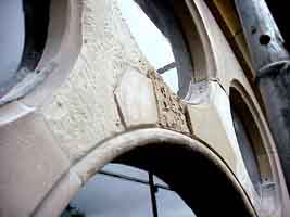 Die alten, beschädigten Sandsteinplatten wurden von uns fachmännisch von der Rosette entfernt und durch neue ersetzt. Der Unterschied wird nicht nur im Gesamtbild deutlich, sondern auch im Detail, wie ein Vergleich von alt und neu zeigt: | |